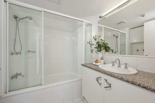 Occupying the prime top-floor corner, the apartment is bathed in natural light from morning to afternoon. The open-plan layout centres around a well-appointed kitchen that flows to a spacious living and dining zone. Large glass sliders open to a balcony where you can enjoy gentle breezes and peaceful water views.