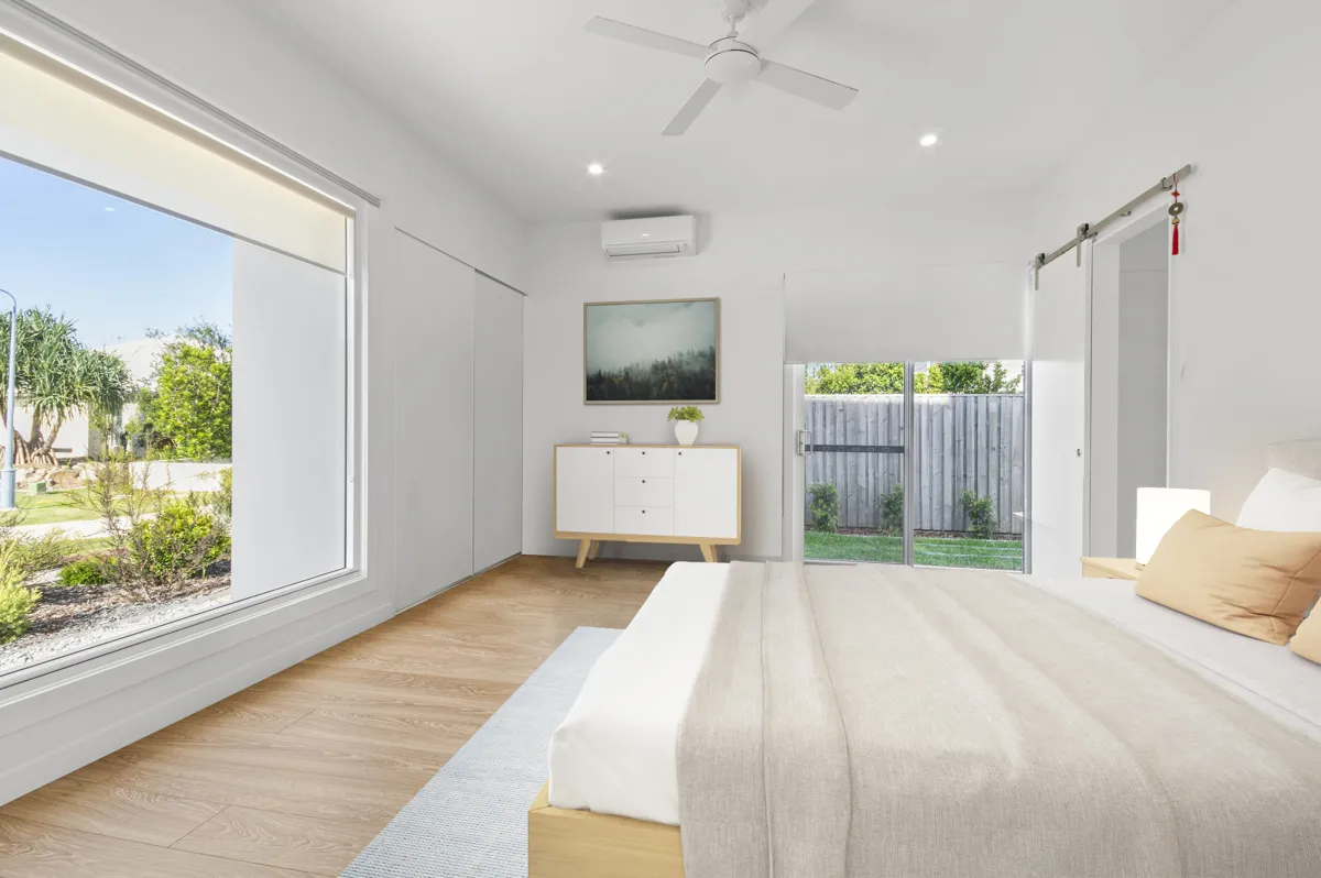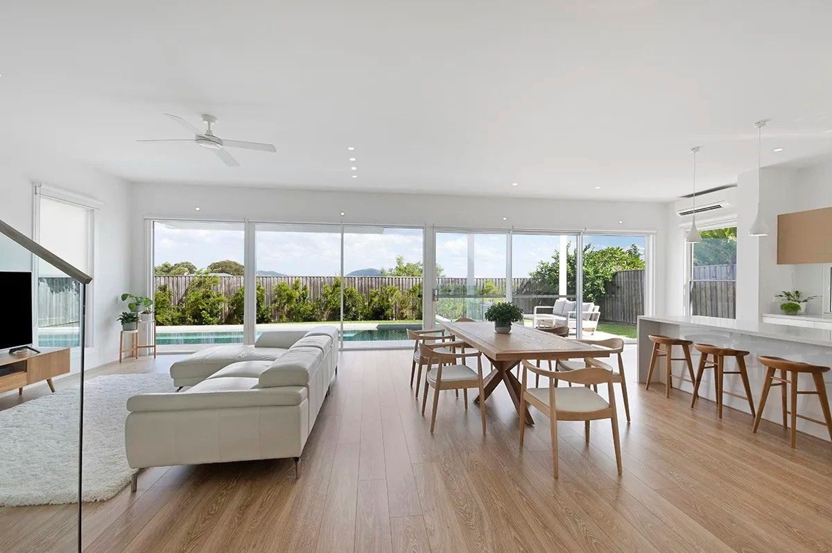 From the moment you enter, you’re greeted by expansive natural light, soaring ceilings (3m downstairs, 2.7m upstairs) and a spectacular framed view of Mount Coolum. Every room is generously proportioned, fully air-conditioned, and designed to embrace the home’s relaxed yet refined beach vibe. Enjoy an evening soak under the stars in a resort-style bathroom or relax in one of the multiple living zones designed for both entertaining and quiet retreat.
